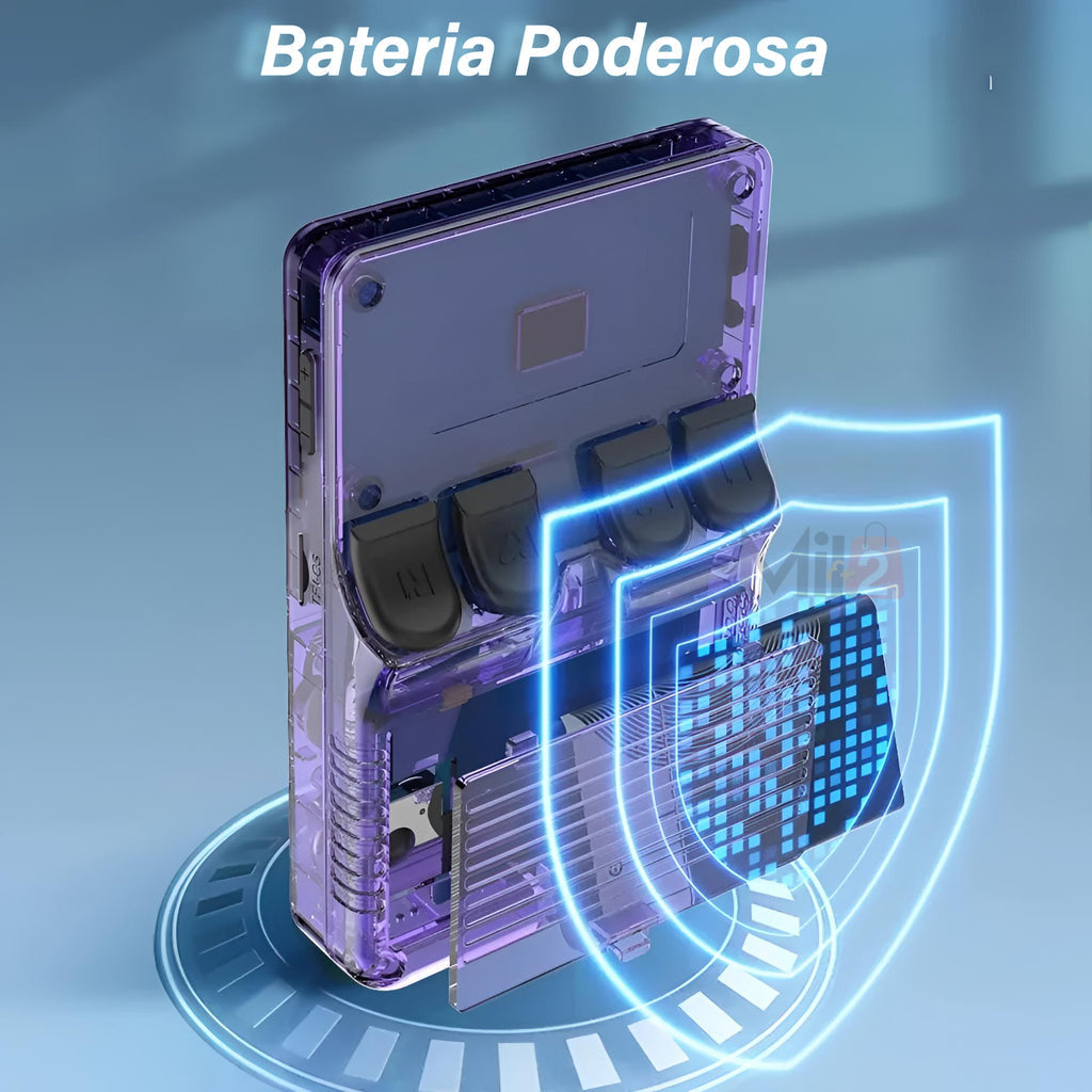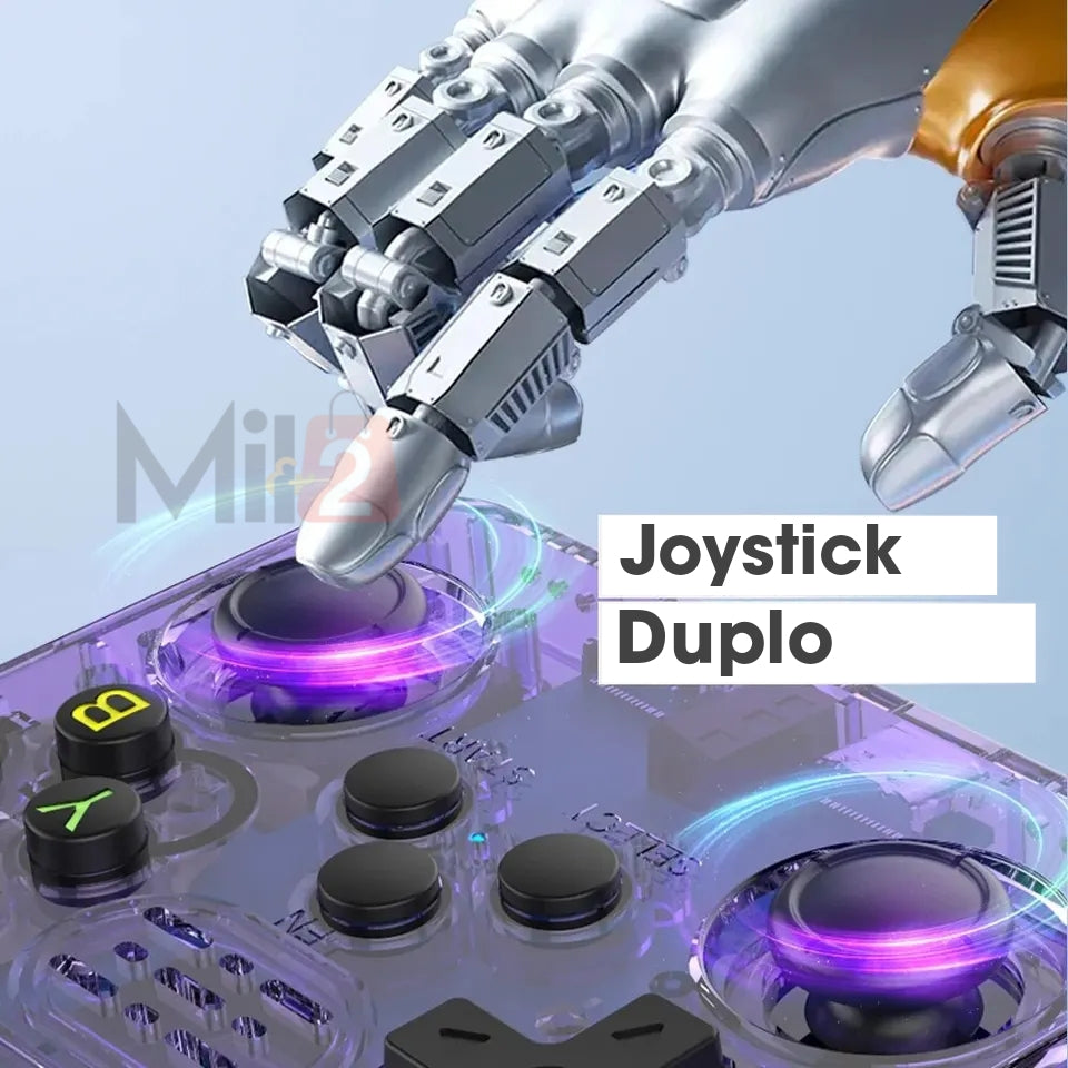 O MiliGame Retro conta com: RAM de Alto Desempenho, tela HD IPS de 3,5 polegadas, resolução de 640x480 pixeis e Joystick Duplo.